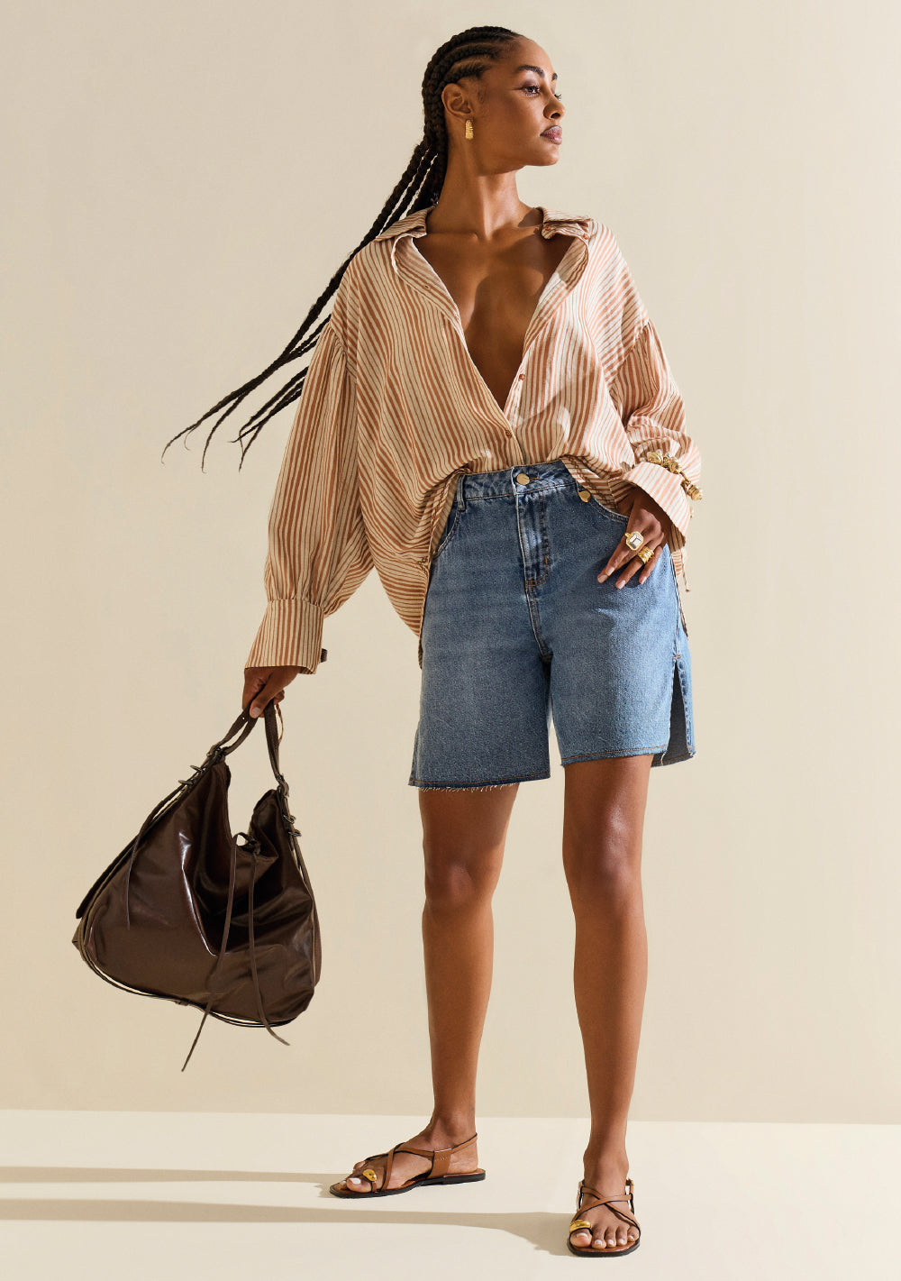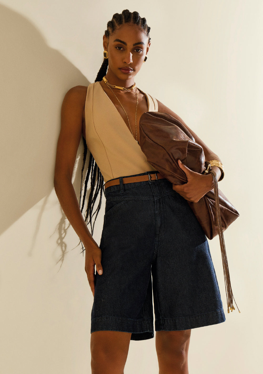 La Bermuda Morena Rosa Recta Alta Azul es la pieza clave para iluminar tu guardarropa...