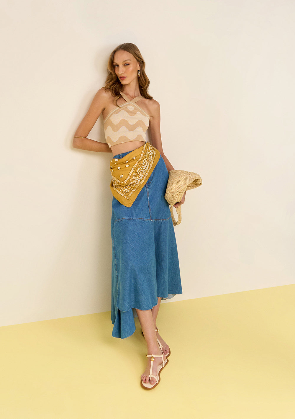 Despierta tu lado auténtico con la falda evasé larga de tiro alto en color azul...