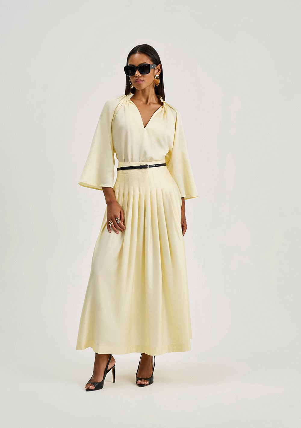 Envuélvete en la sofisticación y ligereza de la falda evasé larga de tiro alto en...