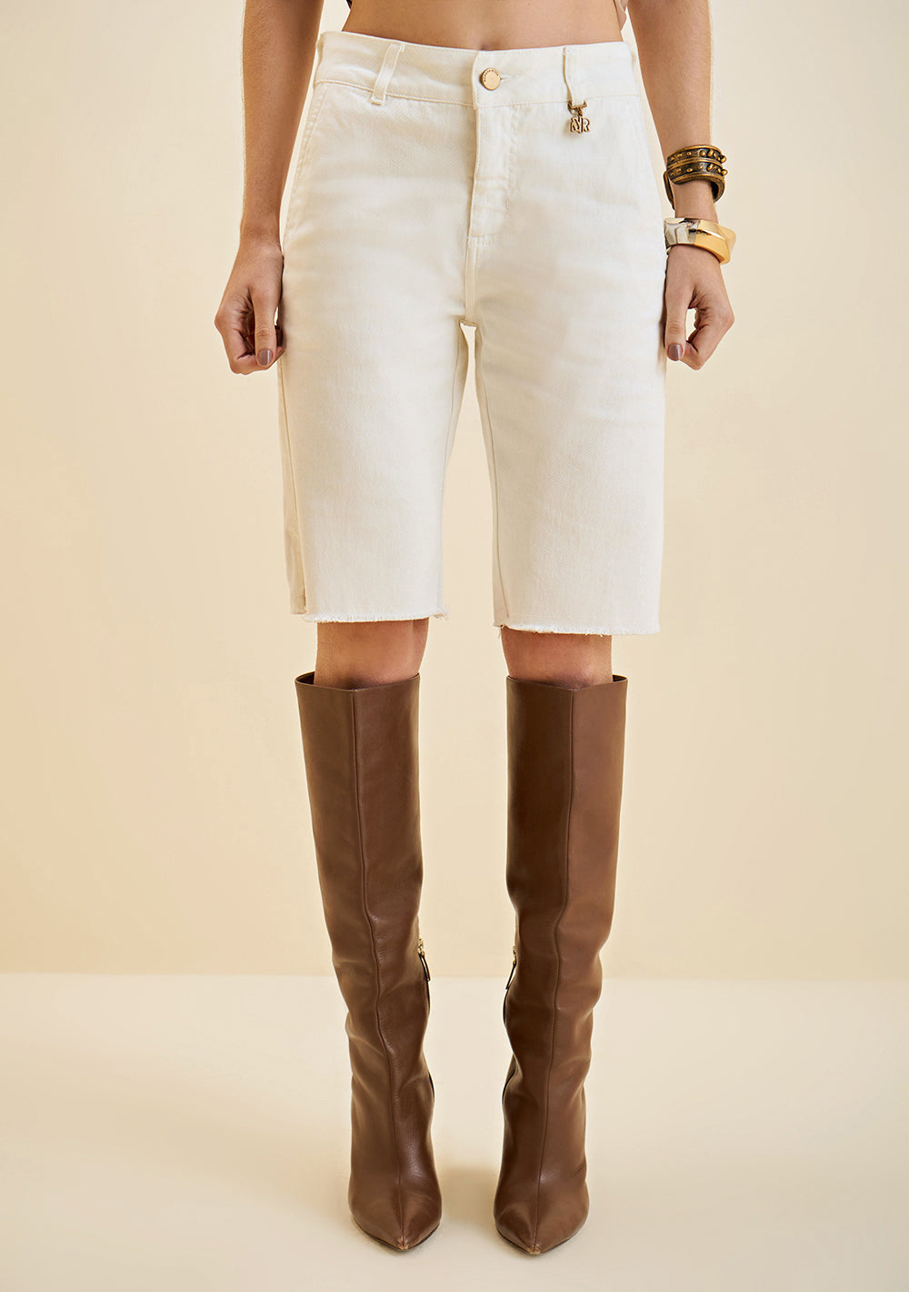 Las bermudas rectas Morena Rosa en off-white son un clásico moderno que realza cualquier armario. Con cintura alta y corte recto, esta prenda de sarga combina algodón y elastano, garantizando comodidad y sofisticación. Ideales para ocasiones formales o sociales, combinan a la perfección con blusas y sandalias.