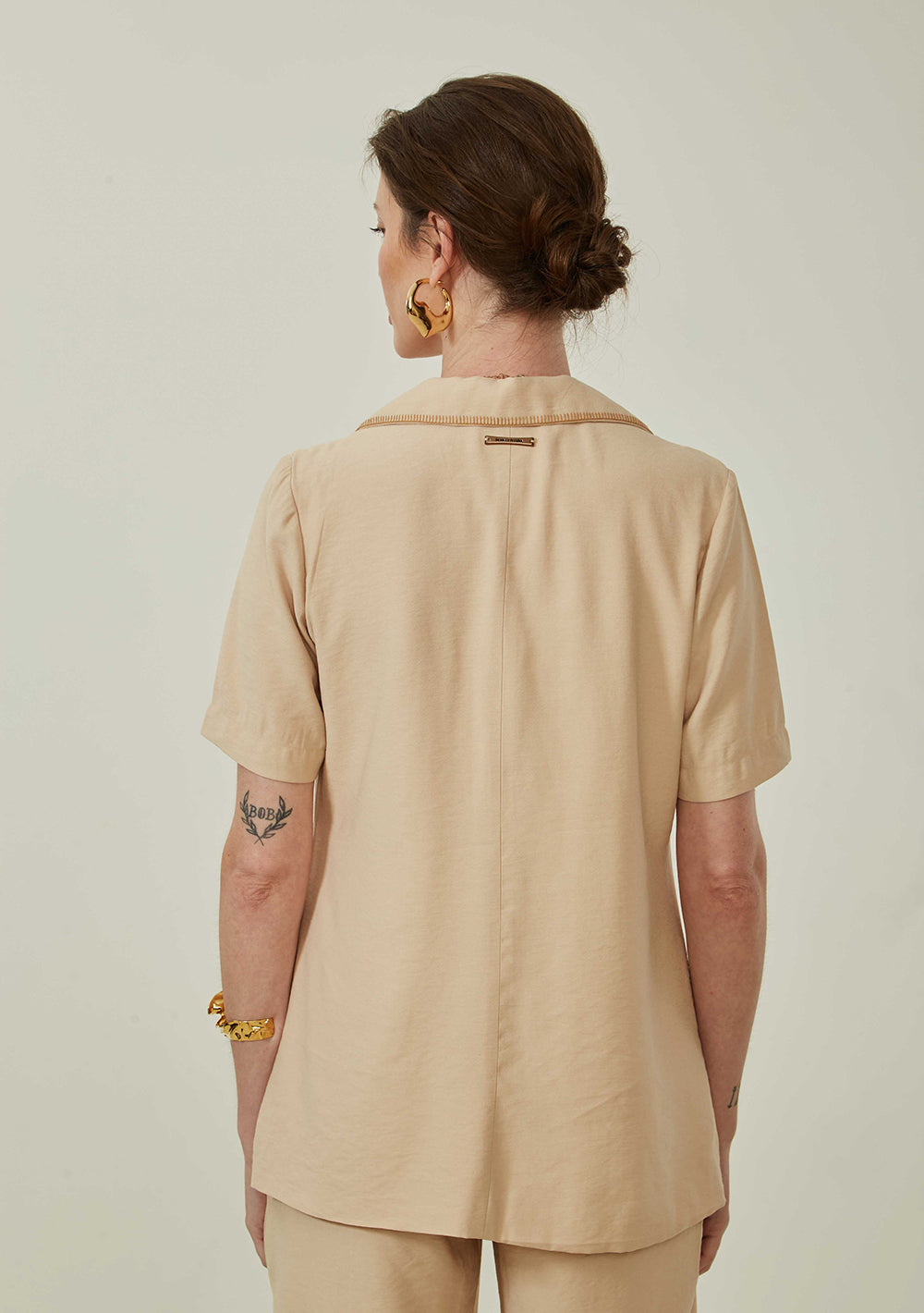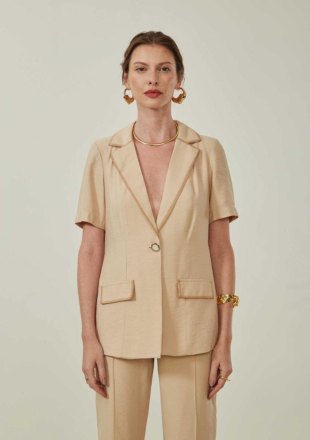 Mejora tu armario con este sofisticado blazer beige de manga corta, ideal para la mujer moderna y realizada. Ofrece ligereza y comodidad, mientras que su forro garantiza un ajuste perfecto. Perfecto para pasar de lo casual a lo elegante, combina a la perfección con pantalones de vestir para reuniones o vaqueros para una comida informal. Complétalo con accesorios metálicos para un toque de glamour. Este blazer representa la esencia de Maria.Valentina: versatilidad y elegancia atemporal para momentos inolvidables. ¡Consíguelo ya y siéntete segura en cualquier ocasión!