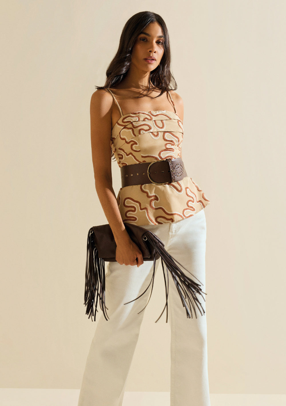 La blusa Morena Rosa ajustada con escote recto sin tirantes en tono beige es la pieza perfecta para quienes buscan un toque de sofisticación y confort en el guardarropa. Confeccionada en viscosa ligera que se adapta suavemente a la silueta femenina, su diseño sin tirantes realza el escote y aporta una elegancia descomplicada. Ideal para crear looks tanto casuales como sofisticados, combina a la perfección con pantalones cargo o skinny, además de accesorios como pendientes statement y sandalias de tiras. La colección À Flor da Pele celebra la brasilidad y la libertad femenina en cada detalle.