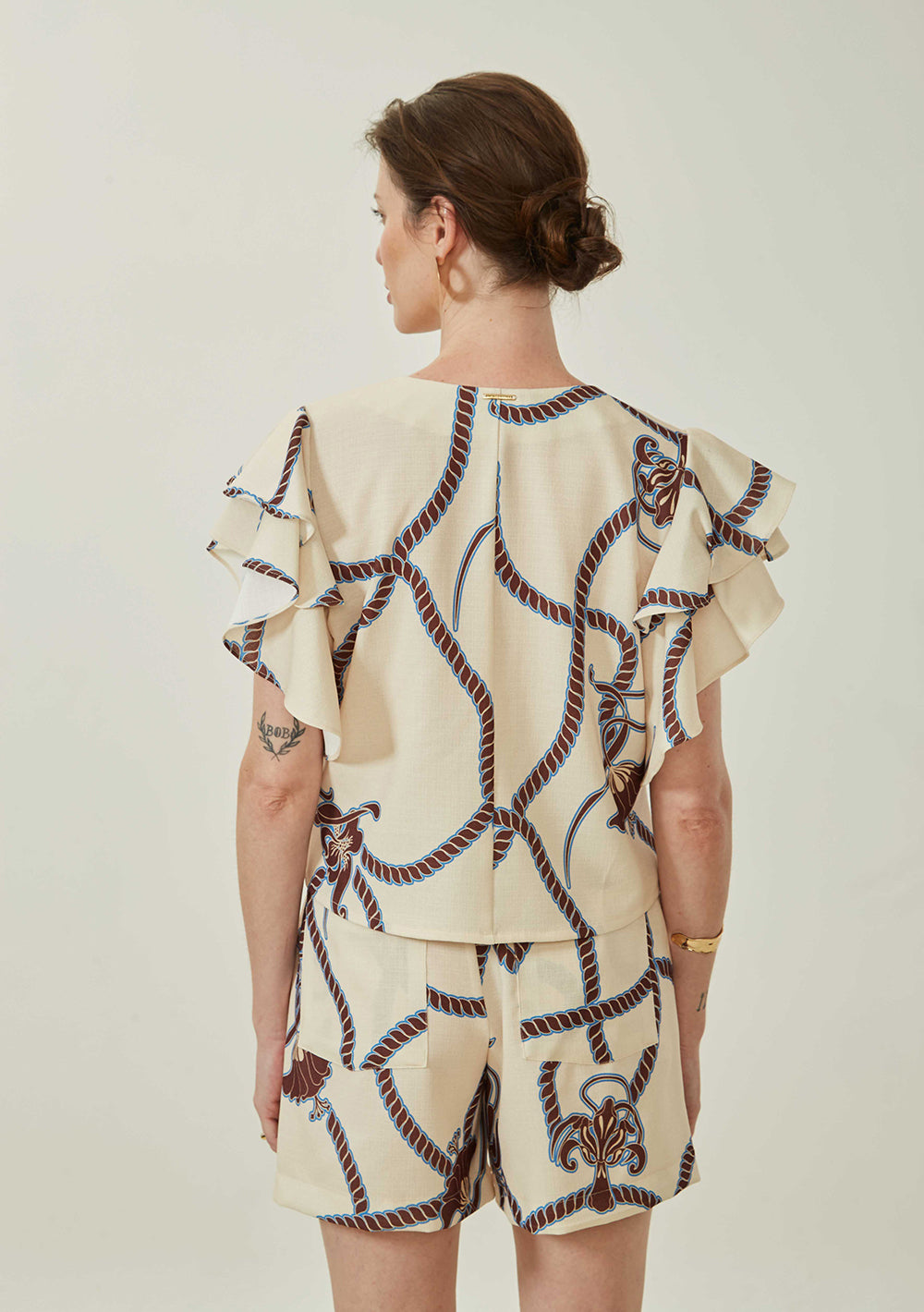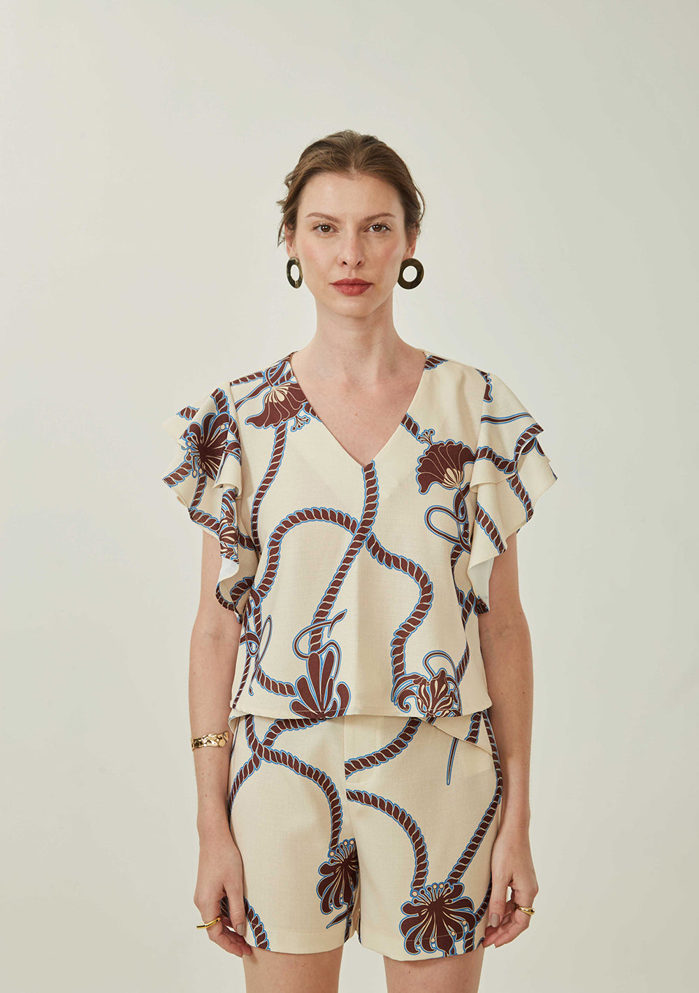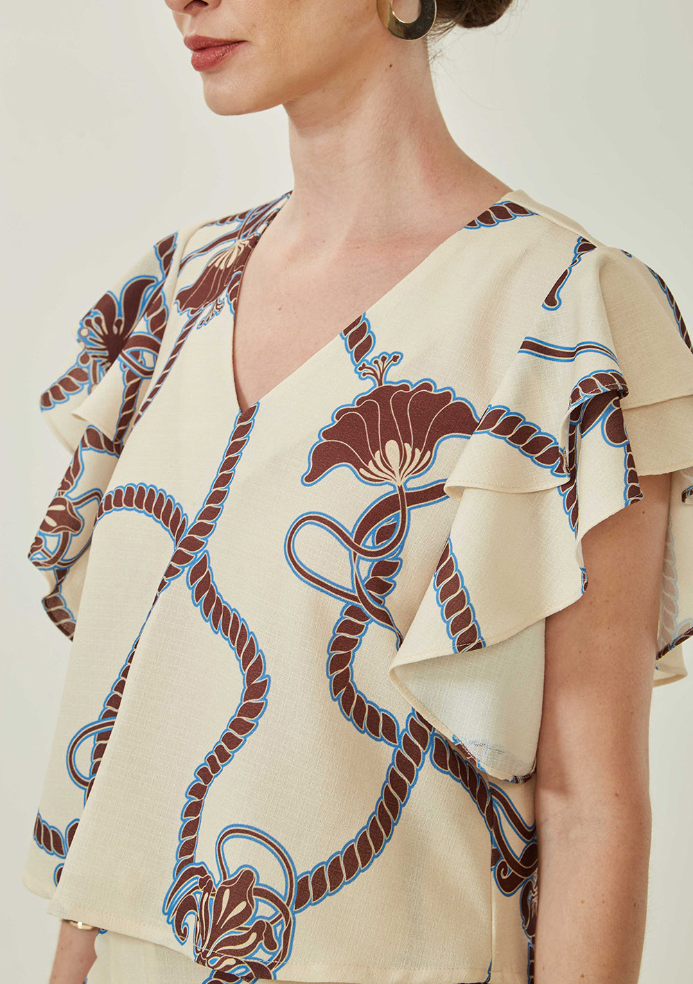 Realza tu estilo con la blusa beige de Maria.Valentina, una prenda imprescindible en el armario de cualquier mujer. Con un elegante escote en V y mangas cortas, su diseño corto refleja a la perfección sofisticación y versatilidad. Ofrece un corte ligero y refinado. Combínala con faldas midi o pantalones de sastre y complétala con accesorios dorados para un toque glamuroso. Ideal para eventos sociales o reuniones profesionales, esta prenda celebra la esencia de la elegancia moderna.