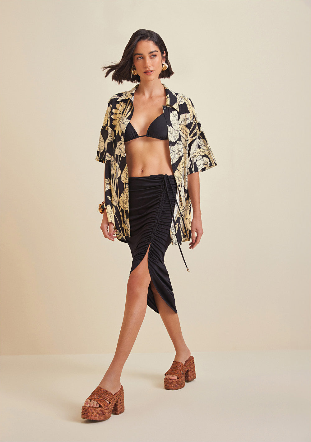 Aportando practicidad y versatilidad al look, la camisa de manga corta con cierre de botones es la pieza clave a la hora de preparar la maleta de vacaciones. Confeccionada en fibra natural de viscosa, brinda ligereza y frescura. La estampa exclusiva de Morena Rosa convierte este modelo en el protagonista ideal para disfrutar de los mejores momentos bajo el sol sin perder la elegancia. Get the look: úsala como salida de playa combinada con bikinis o enterizos lisos o estampados, o dale un toque especial a tus looks casuales combinándola con tops, pantalones, faldas o shorts, y completa el estilo con sandalias planas o alpargatas.