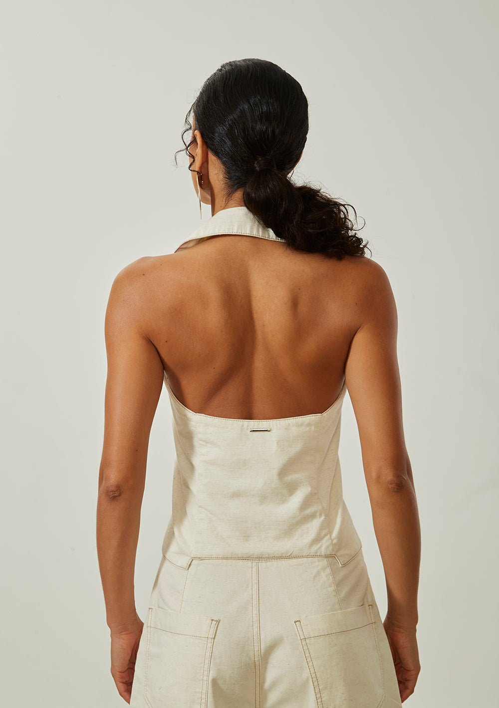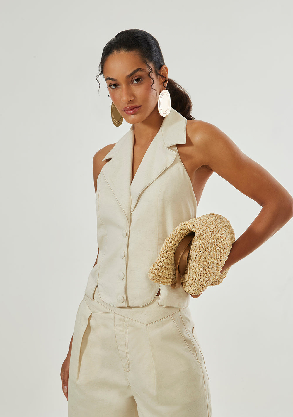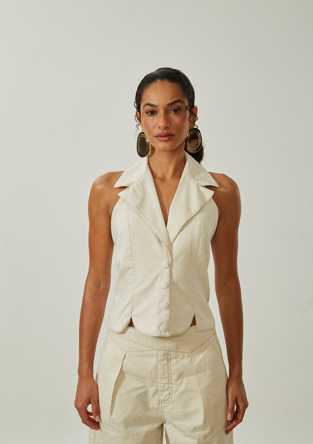 Transforma tu look con la sofisticación del chaleco ajustado en off white de Maria.Valentina, una pieza que combina la elegancia de la sarga con la suavidad del algodón, el modal y el lino. Ideal tanto para eventos como para el día a día, se adapta a diversos estilos. Combínalo con una blusa de seda y pantalones de sastrería para un look refinado, o apuesta por unos jeans y una camiseta para un toque más casual. Completa con accesorios de cuero marrón o dorado para resaltar tu presencia. Parte de la colección “Narrazione”, esta prenda refleja el equilibrio entre tradición y modernidad.