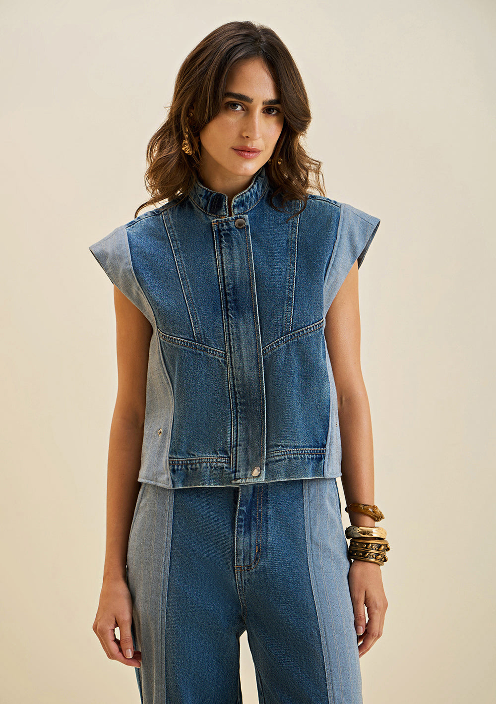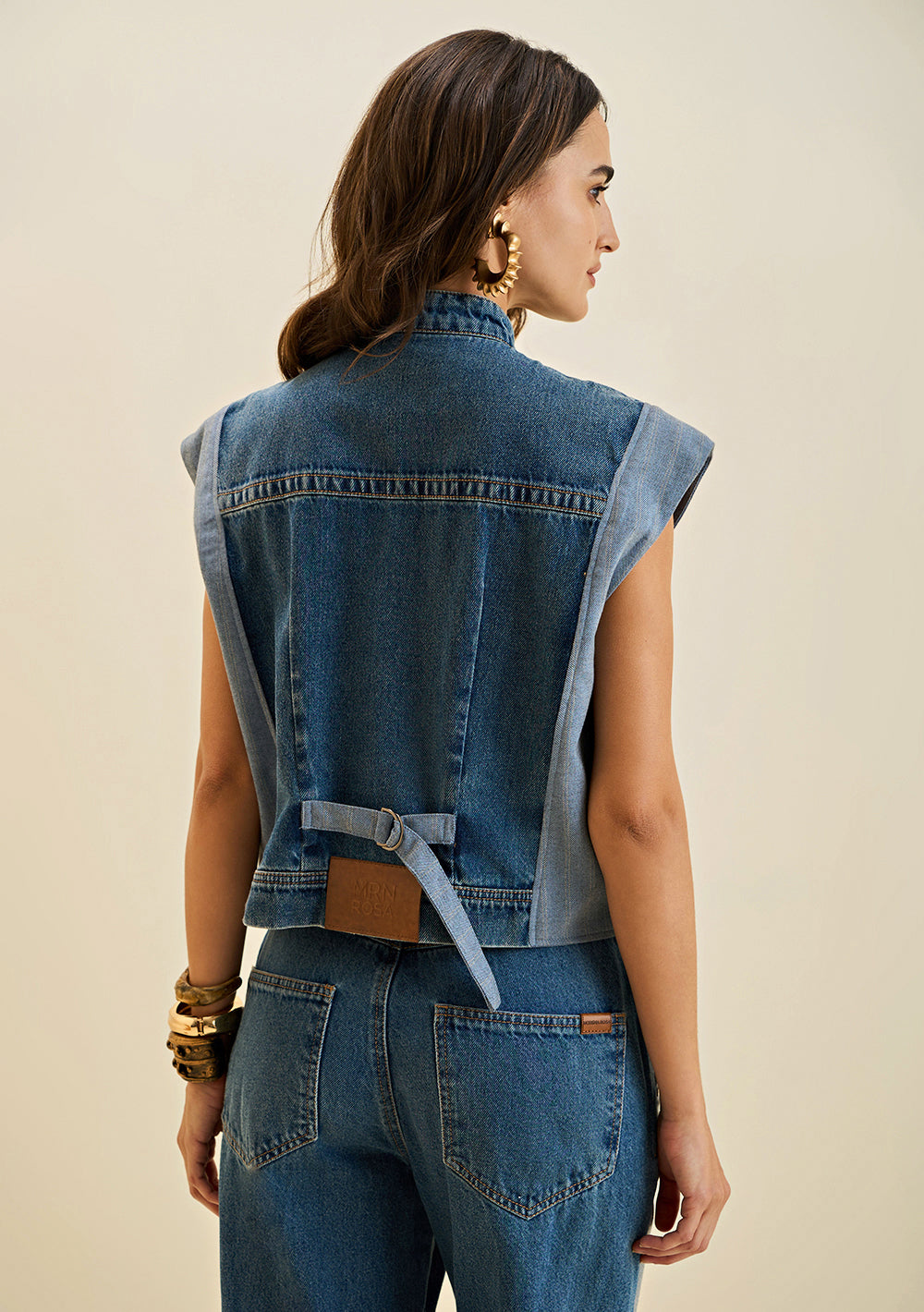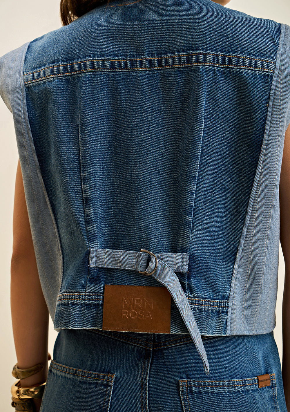 Chaleco con mix de tejidos que lleva la elegancia de la sastrería al universo del denim.