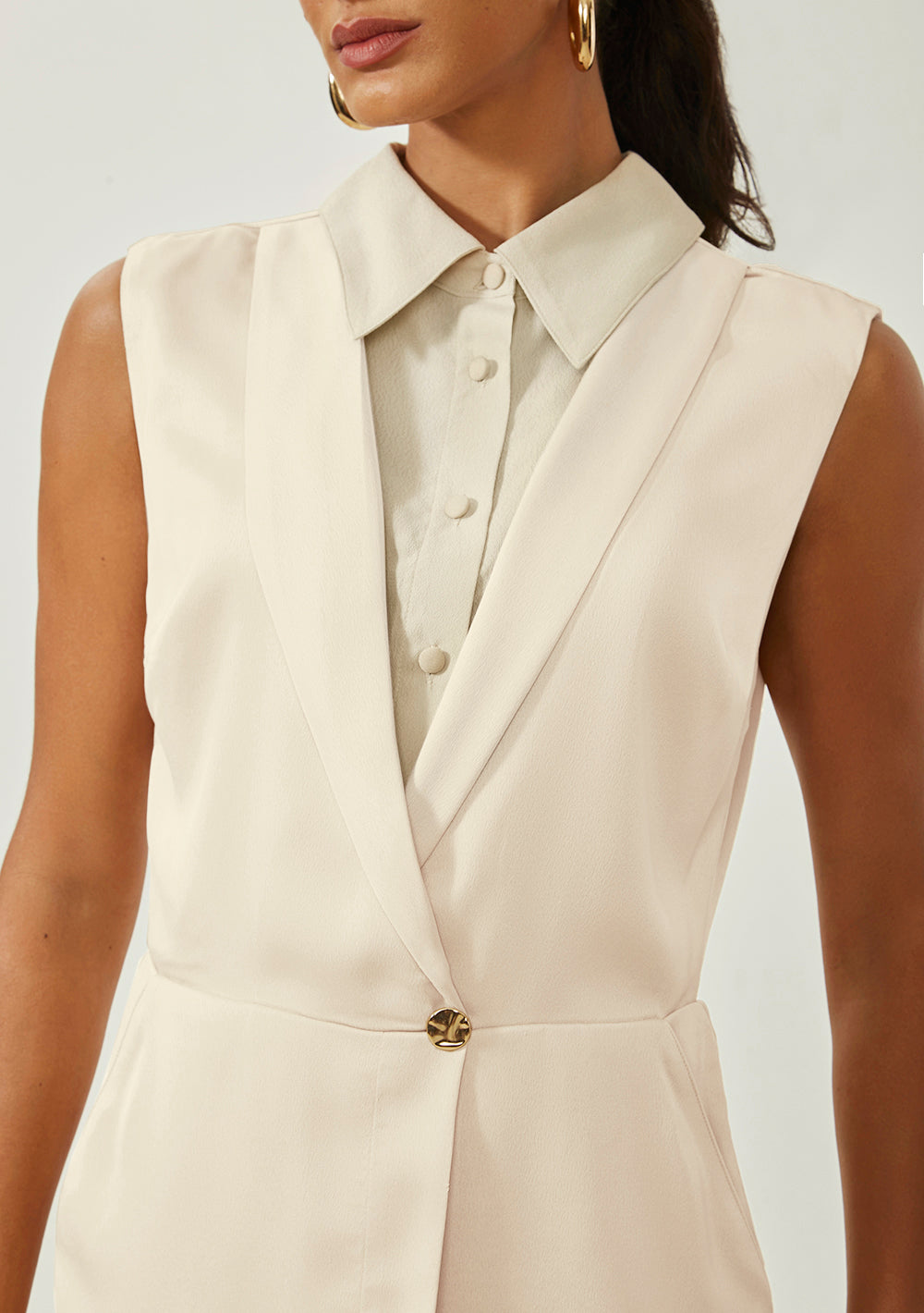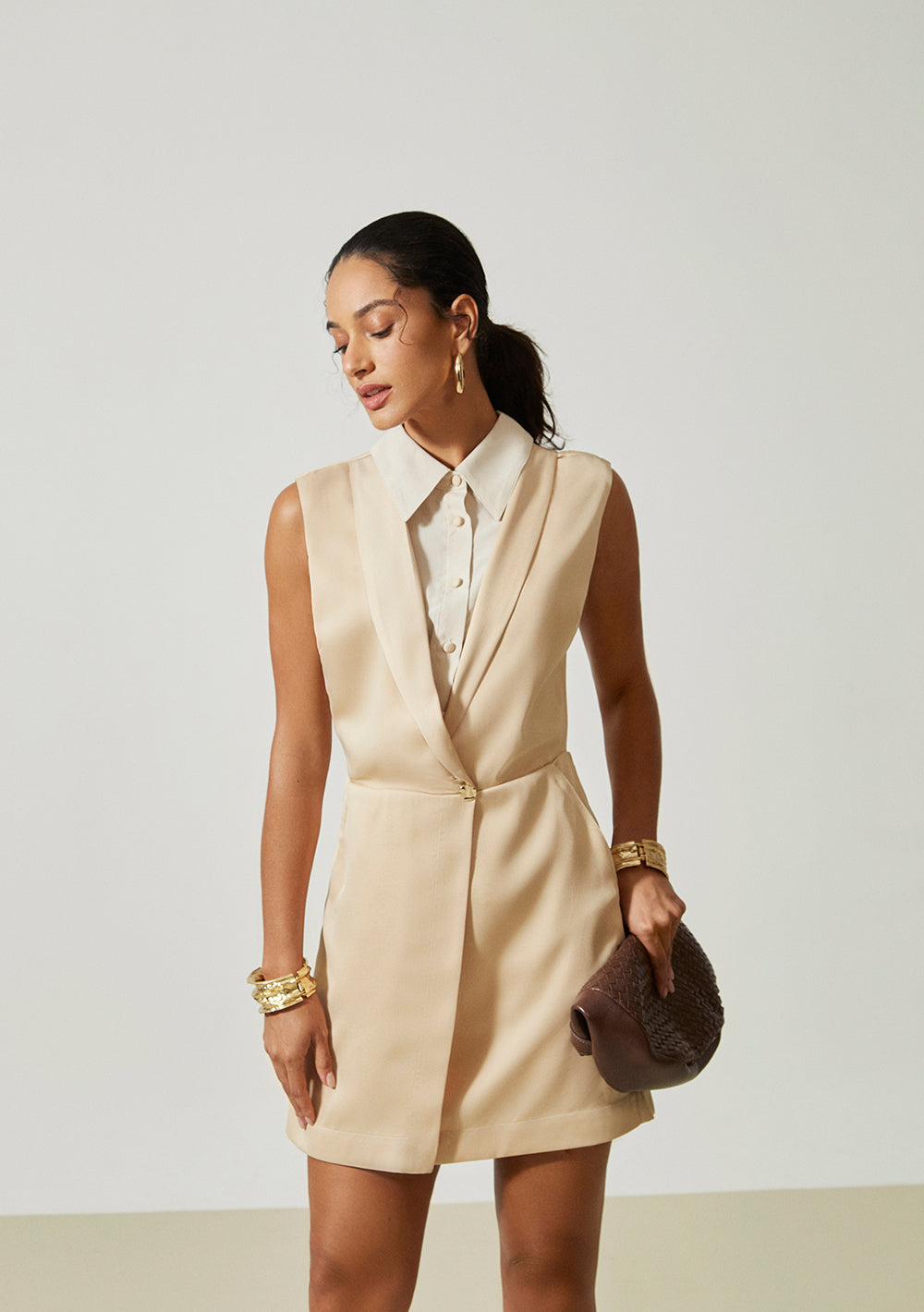 El mono sin mangas de Maria.Valentina es la máxima expresión de la elegancia moderna. Su silueta ajustada, junto al sofisticado escote cruzado, garantiza un ajuste impecable, ideal tanto para ocasiones casuales como para reuniones de trabajo. Confeccionado en sastrería de alta calidad en tono beige neutro, combina a la perfección con accesorios metálicos y sandalias de tacón. Elaborado en viscosa, ofrece comodidad y ligereza, reflejando la esencia femenina y contemporánea de la colección que une tradición y modernidad. Compleméntalo con un bolso estructurado y estarás lista para brillar en cualquier ocasión.