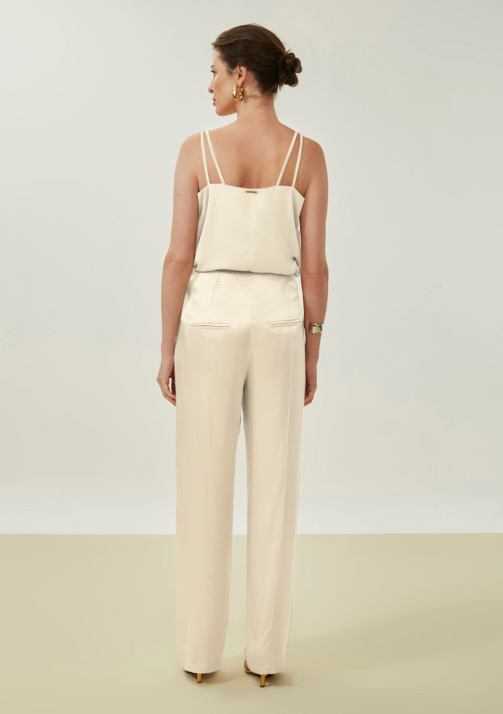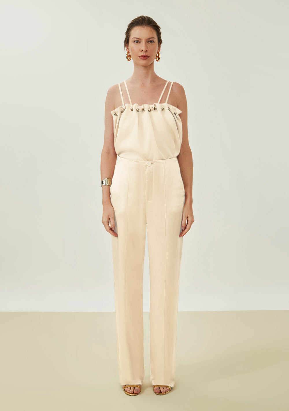 Desborda sofisticación con este pantalón recto de tiro alto en color beige de Maria.Valentina, una prenda que une elegancia y comodidad. Confeccionado en 100% viscosa, ofrece una caída perfecta para ocasiones nocturnas. Su tono neutro invita a combinarlo con blusas estampadas o camisas de seda, complementadas con accesorios dorados para crear un look glamuroso e impactante. Ideal para cenas elegantes o reuniones importantes, este pantalón es la elección acertada para la mujer moderna que valora el estilo y la autoconfianza. Siéntete lista para impresionar y brillar en cualquier ambiente.