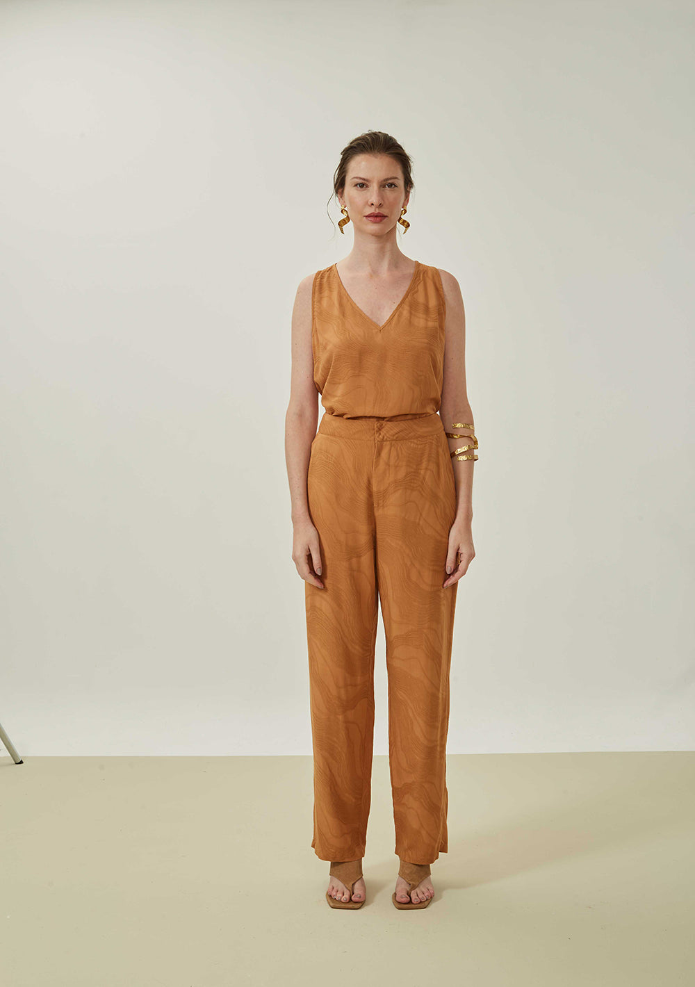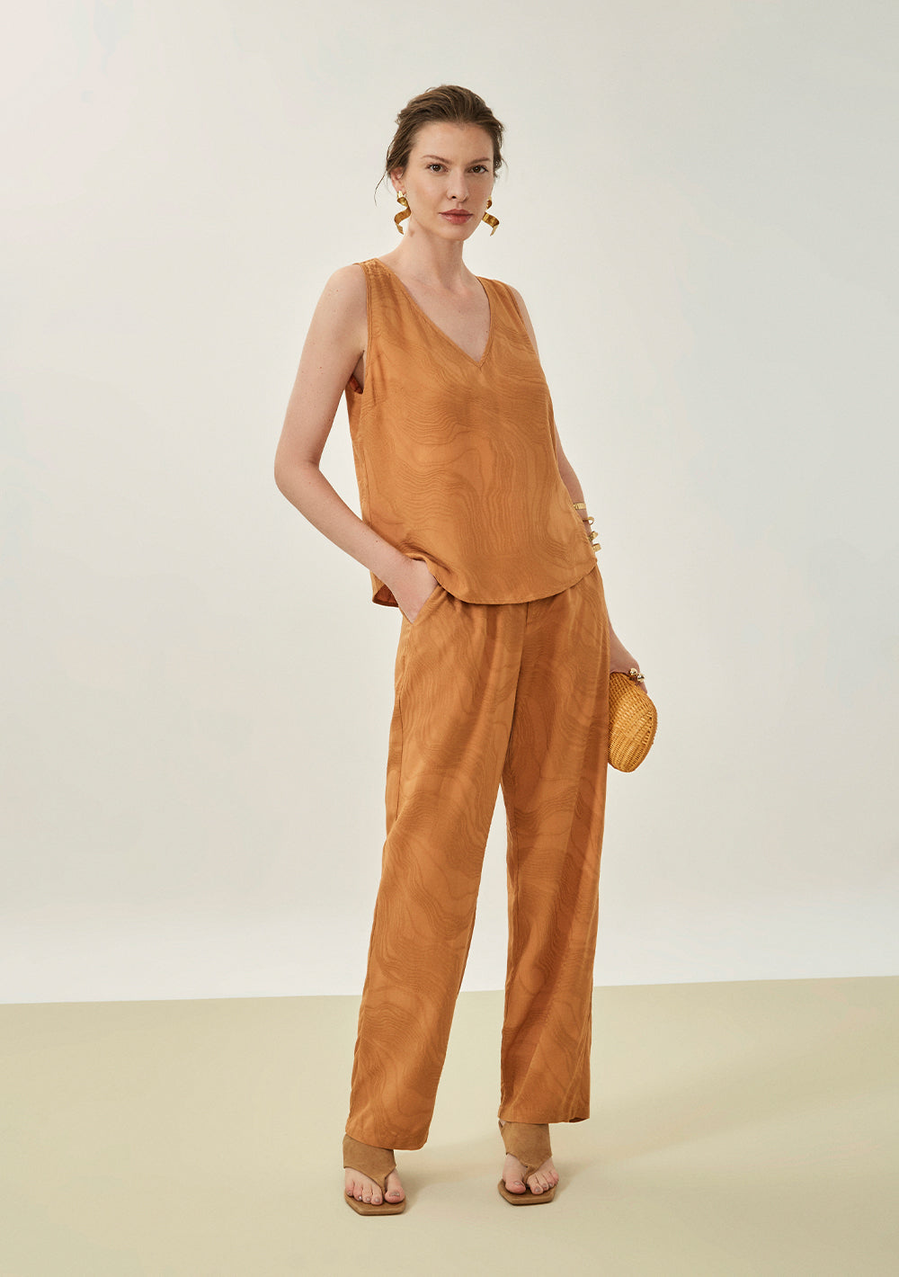 Eleva tu guardarropa con el pantalón recto de tiro alto en color marrón de Maria.Valentina, una prenda que irradia sofisticación y comodidad. Confeccionado en 100% viscosa, ofrece una caída perfecta que realza tu silueta, ideal para cenas elegantes o reuniones importantes. Combínalo con blusas de seda, blazers estructurados y accesorios dorados para un look impecable. La colección celebra la conexión entre pasado y presente, aportando un toque de clase atemporal que refleja la esencia de la mujer moderna y segura de sí misma. Apuesta por la elegancia y versatilidad de esta pieza esencial y siéntete poderosa en cualquier ocasión.