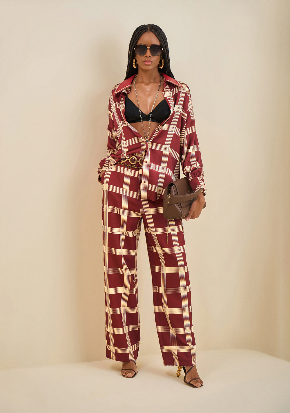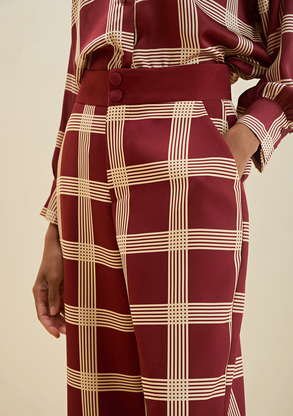Eleva tu estilo con la elegancia y actitud del pantalón wide de tiro alto en tono bordó.