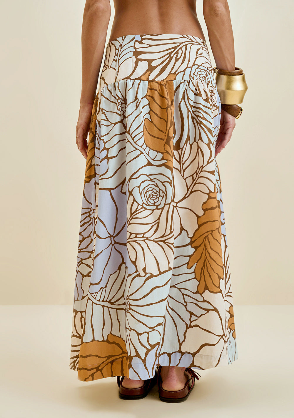 Descubre el encanto bohemio y sofisticado de esta pollera larga confeccionada en 100% algodón, ideal para acompañar los días soleados de verano. Con su diseño evasé y tiro medio, aporta movimiento fluido y frescura, realzando la silueta femenina con naturalidad. El estampado floral en tonos tierra y suaves contrasta a la perfección con la ligereza del tejido, evocando la esencia vibrante del estilo carioca. Perfecta para combinar con tops o bikinis de la misma colección, esta pieza versátil te permite transitar de la playa a un paseo urbano con charme y autenticidad.