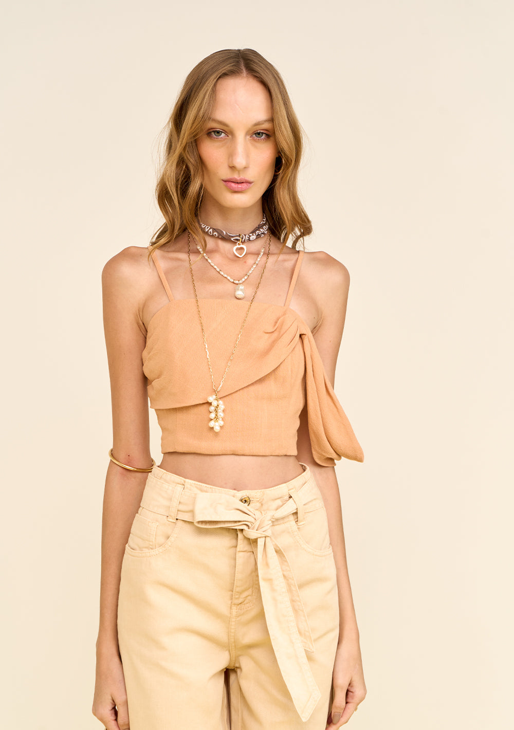 Top Zinco de escote recto confeccionado en viscosa y lino, una pieza que combina frescura y sofisticación en un diseño moderno. Con tiras finas y un detalle drapeado que cae con elegancia en los hombros, este top realza tu feminidad con un aire contemporáneo. Su mezcla de tejidos naturales aporta ligereza y comodidad, ideal para los días cálidos de la temporada. Parte de la colección Horizontes, refleja la dualidad entre modernidad y tradición, permitiéndote crear looks auténticos y memorables. Combínalo con pantalones de sastrería o faldas fluidas para un estilo versátil que te acompañará en cualquier ocasión.