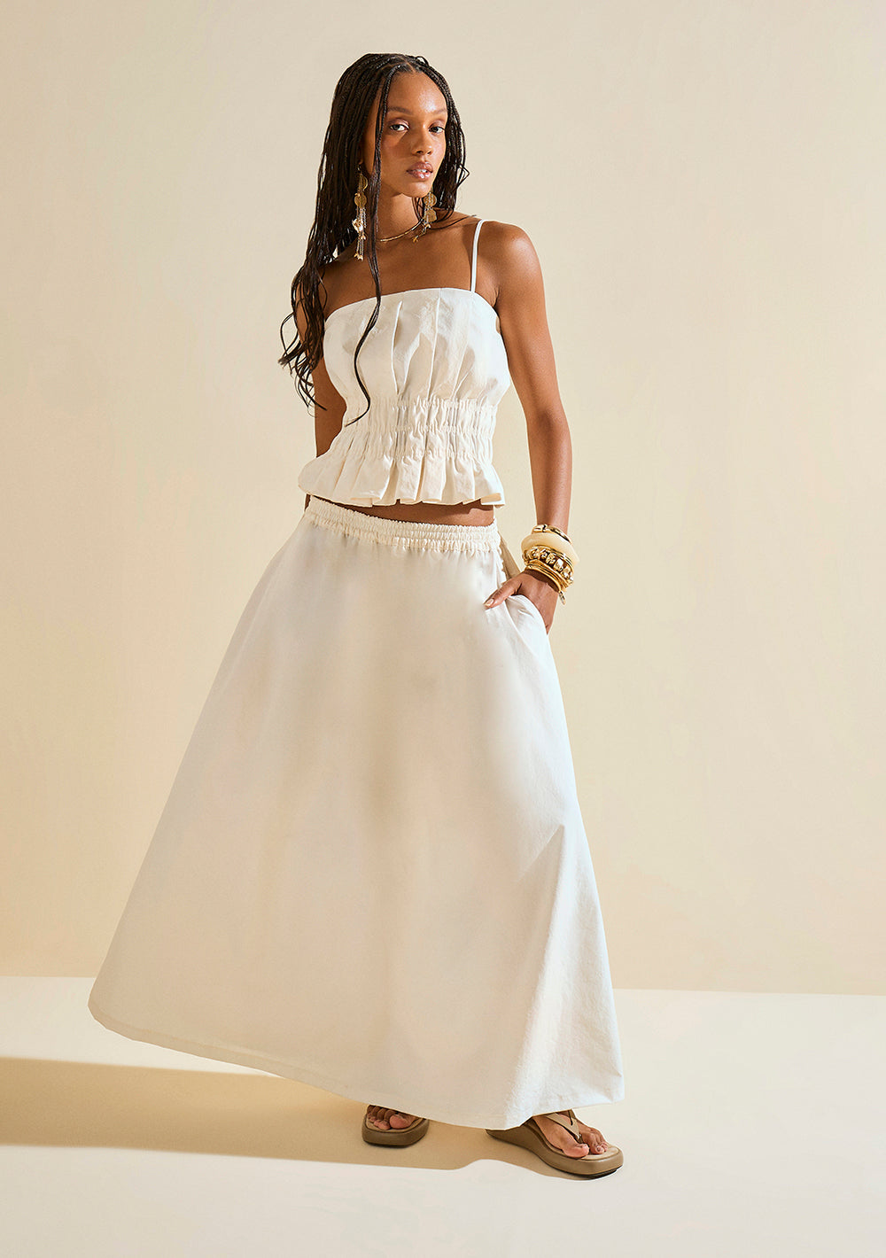 Transforma tu guardarropa con el top de escote cuadrado y tiras finas en color off white de Morena Rosa, una prenda que encapsula la esencia de la colección Ela é Carioca! con su diseño relajado y sofisticado. Este top, ideal para ocasiones casuales, está confeccionado para resaltar la feminidad y el encanto de la mujer moderna. Con un escote cuadrado elegante y tiras delgadas, es perfecto para combinar con pantalones cargo o skinny, creando looks versátiles que van del día a la noche. Su composición de alta calidad ofrece comodidad mientras exalta la brasilidad con un toque contemporáneo. Proyecta confianza y estilo en cualquier escenario, ya sea en una cena a la luz de las velas o en eventos sociales. Invierte en un look que celebra tu autenticidad y sé protagonista dondequiera que vayas.