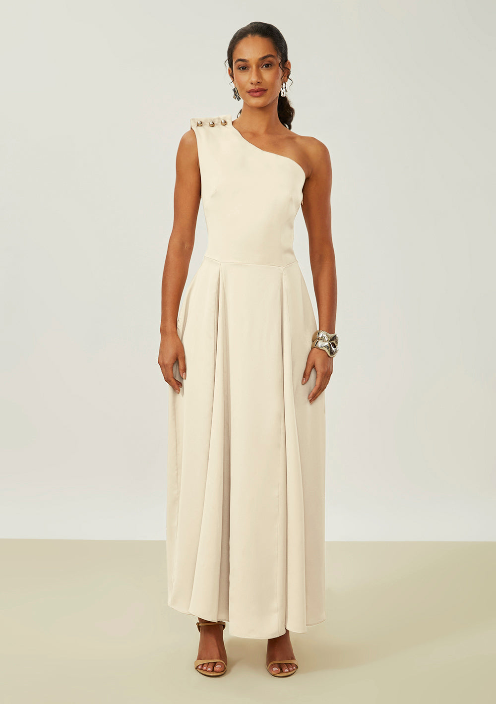 Envuélvete en la sofisticación y elegancia del vestido largo beige de un solo hombro de Maria.Valentina. Con un diseño que realza la silueta femenina, esta pieza confeccionada en crepé ofrece un ajuste impecable y un confort inigualable. Su tonalidad neutra lo convierte en un comodín para cualquier ocasión, ya sea un evento casual o una fiesta. Combínalo con sandalias de tiras finas y un clutch minimalista para un look moderno y refinado, ideal para mujeres que desean expresar autoconfianza y estilo en cada detalle.