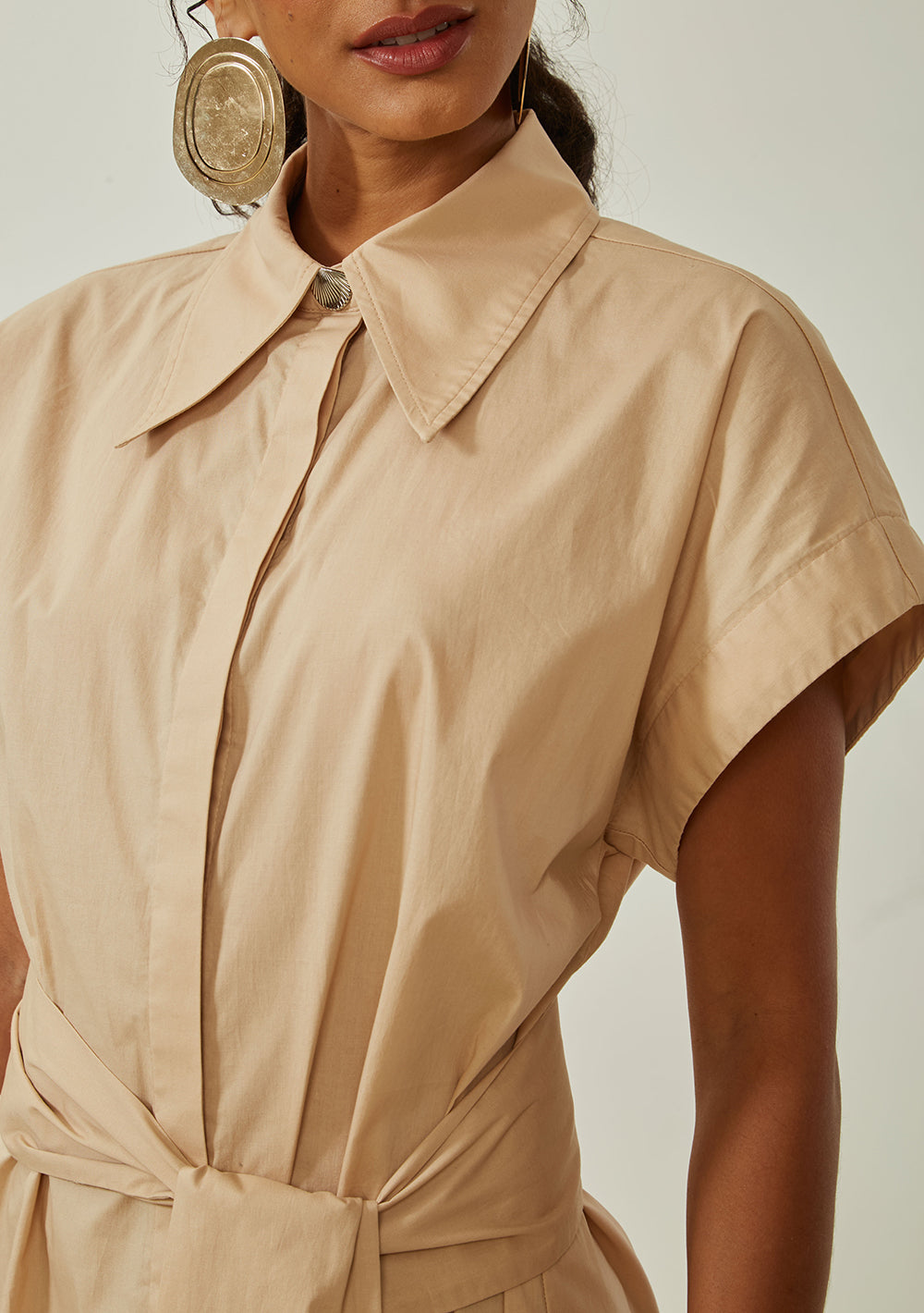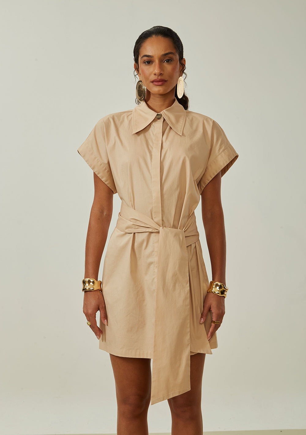 La elegancia práctica y atemporal define este vestido corto beige de Maria.Valentina, una pieza esencial para cualquier estación. Con cuello clásico y mangas cortas, ofrece versatilidad para transitar del calor del verano al encanto de los días más frescos, bastando añadir un abrigo. Confeccionado en 100% algodón tricoline, asegura comodidad y estilo tanto en ocasiones casuales como en eventos sofisticados. Combínalo con sandalias de tiras delicadas para el día o con tacones robustos y accesorios dorados para una cena especial. Parte de una colección que celebra la sofisticación atemporal y la memoria femenina, este vestido rinde homenaje a la mujer moderna que valora su esencia y conquistas.