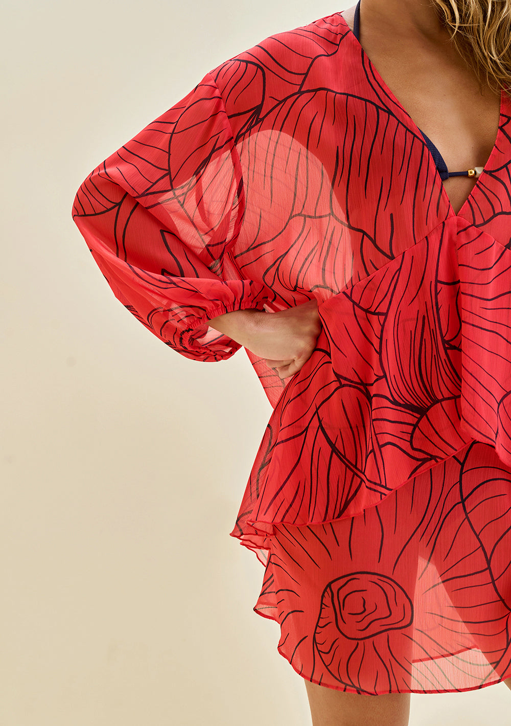 Resalta tu encanto natural con el Vestido Morena Rosa Beach Suelto Escote V Manga Larga Corto Rojo, confeccionado en poliamida ligera que aporta frescura y comodidad en los días de verano. Su diseño fluido con estampado exclusivo refleja la esencia vibrante del estilo playero, mientras que el escote en V y las mangas largas añaden un toque moderno y sofisticado. Ideal para llevar sobre el bikini o traje de baño, es la prenda perfecta para pasar de la playa al atardecer con elegancia. Combínalo con accesorios naturales y sandalias planas para un look auténtico y lleno de bossa.